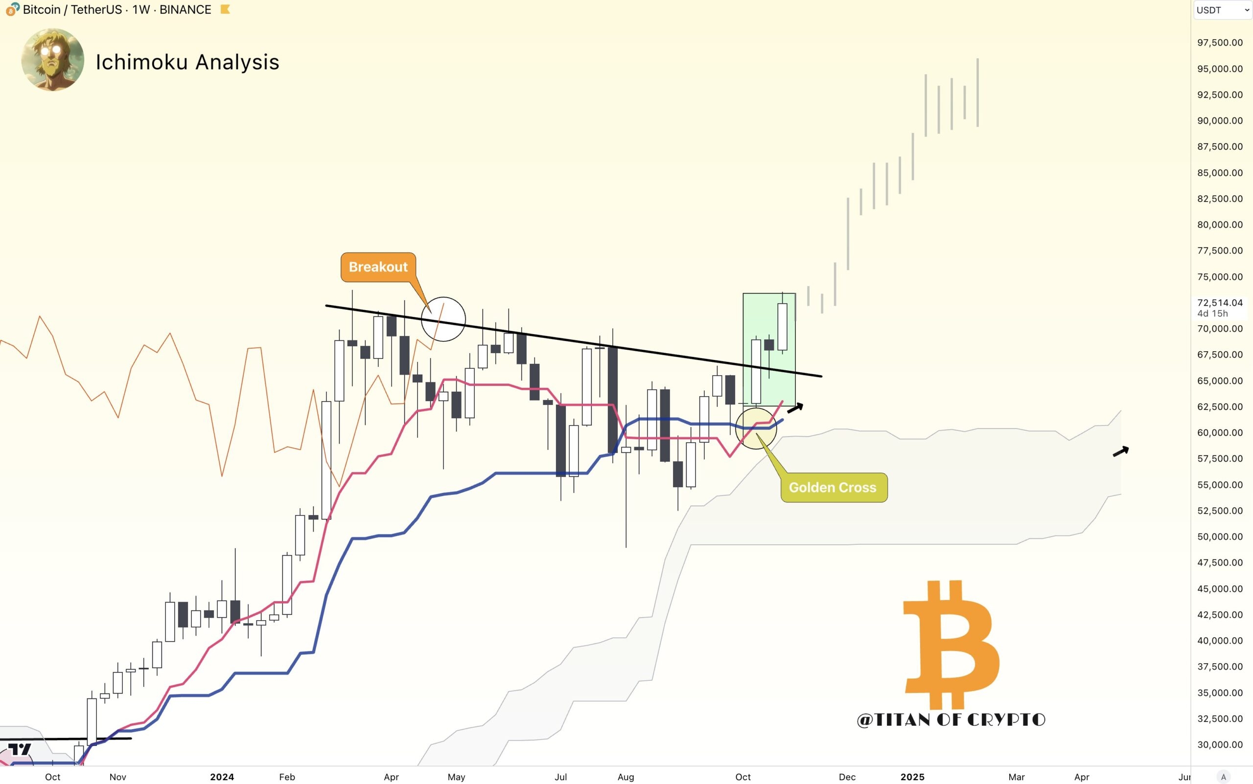 "Lo slancio rialzista di Bitcoin è tornato. Dal punto di vista dell'indicatore Ichimoku, Bitcoin sembra essere in una tendenza al rialzo mentre si avvicina alla fine dell'anno. Il prezzo è al di sopra di tutte le linee e del cloud stanno tutti puntando verso l'alto. Il periodo di tempo in ritardo è al di sopra del prezzo e lo sta superando ".