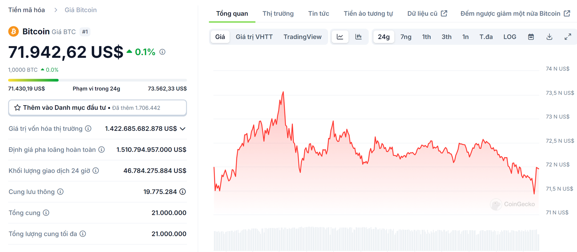 Al momento in cui scrivo, il prezzo di BTC (Bitcoin) viene scambiato intorno alla soglia dei 71.900 USD, quasi stabile nelle ultime 24 ore. A un certo punto il prezzo di BTC era vicino al suo massimo storico (ATH), ma poi ha incontrato una forte pressione per realizzare profitti al picco.