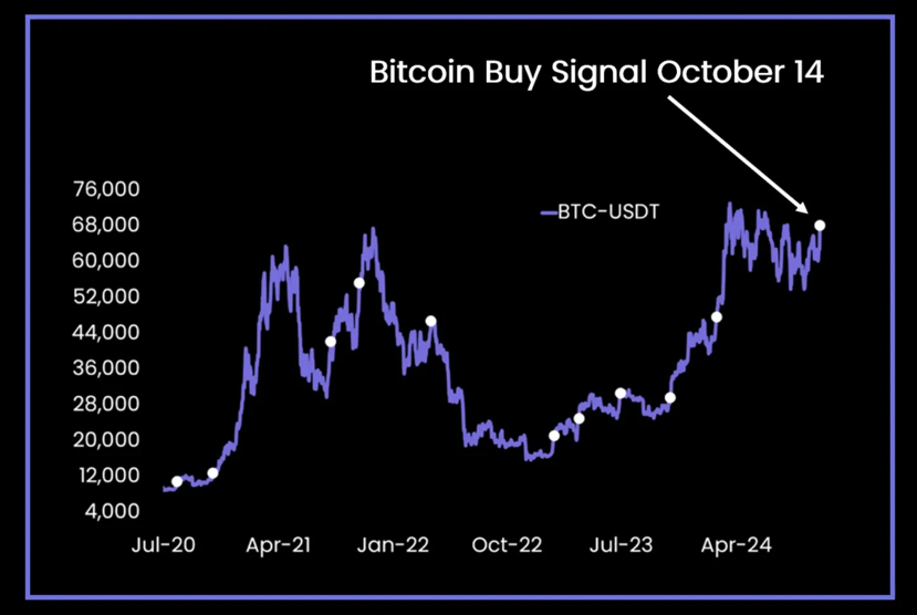Anche un altro modello creato e sviluppato da 10x Research ha inviato un segnale di acquisto più recentemente il 14 ottobre, quando BTC veniva ancora scambiato intorno alla soglia dei 63.000 USD. 10x Research afferma che questo modello di previsione ha un tasso di precisione fino all'86,7% sulla base dei 15 segnali più recenti.
