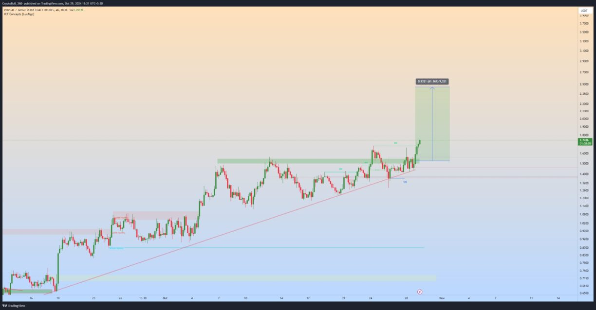 L'analista di criptovalute di X osserva che POPCAT sta progredendo costantemente verso la soglia prevista di $ 2,5. Dopo la rottura riuscita di un modello a cuneo ascendente, il token mostra un forte slancio verso l'alto supportato da un aumento del volume.