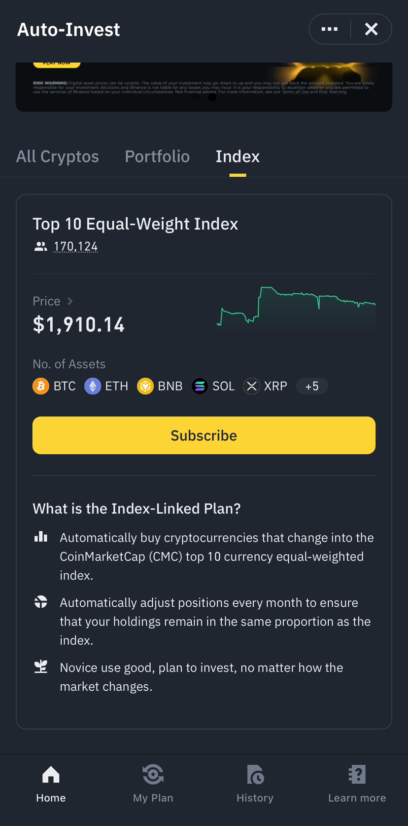 Alloca il 20-50% dei tuoi Fondi: Usa questa porzione dei tuoi fondi per investimenti graduali a lungo termine nelle criptovalute più rispettabili. Scegli alcuni tra i primi 10 nella lista per capitalizzazione di mercato in qualsiasi proporzione tu preferisca. Personalmente, utilizzo la funzione Auto-Invest di Binance per investire in un indice top-10. Evita di comprare una grande quantità in una sola volta; piuttosto, stabilisci un programma per investire una piccola somma settimanale, giornaliera o due volte a settimana, intorno all'1% dei tuoi fondi, che è un ottimo modo per implementare il Dollar-Cost Averaging (DCA).