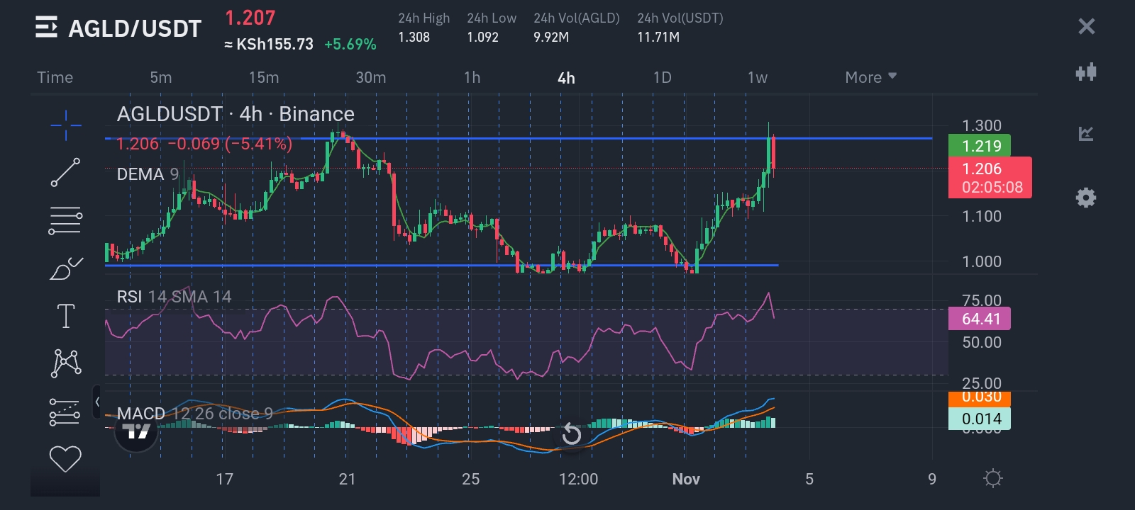 Il prezzo ha raggiunto un livello chiave di resistenza intorno a $1.21, dove è stato rifiutato in precedenza. Questo potrebbe agire come una significativa resistenza al rialzo.