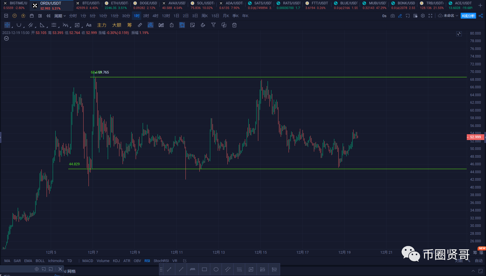 La recente impennata di ORDI non ha molto spazio; si può notare che siamo già entrati in un trading laterale ai massimi. Il supporto a 44 dollari ha mantenuto il prezzo diverse volte.