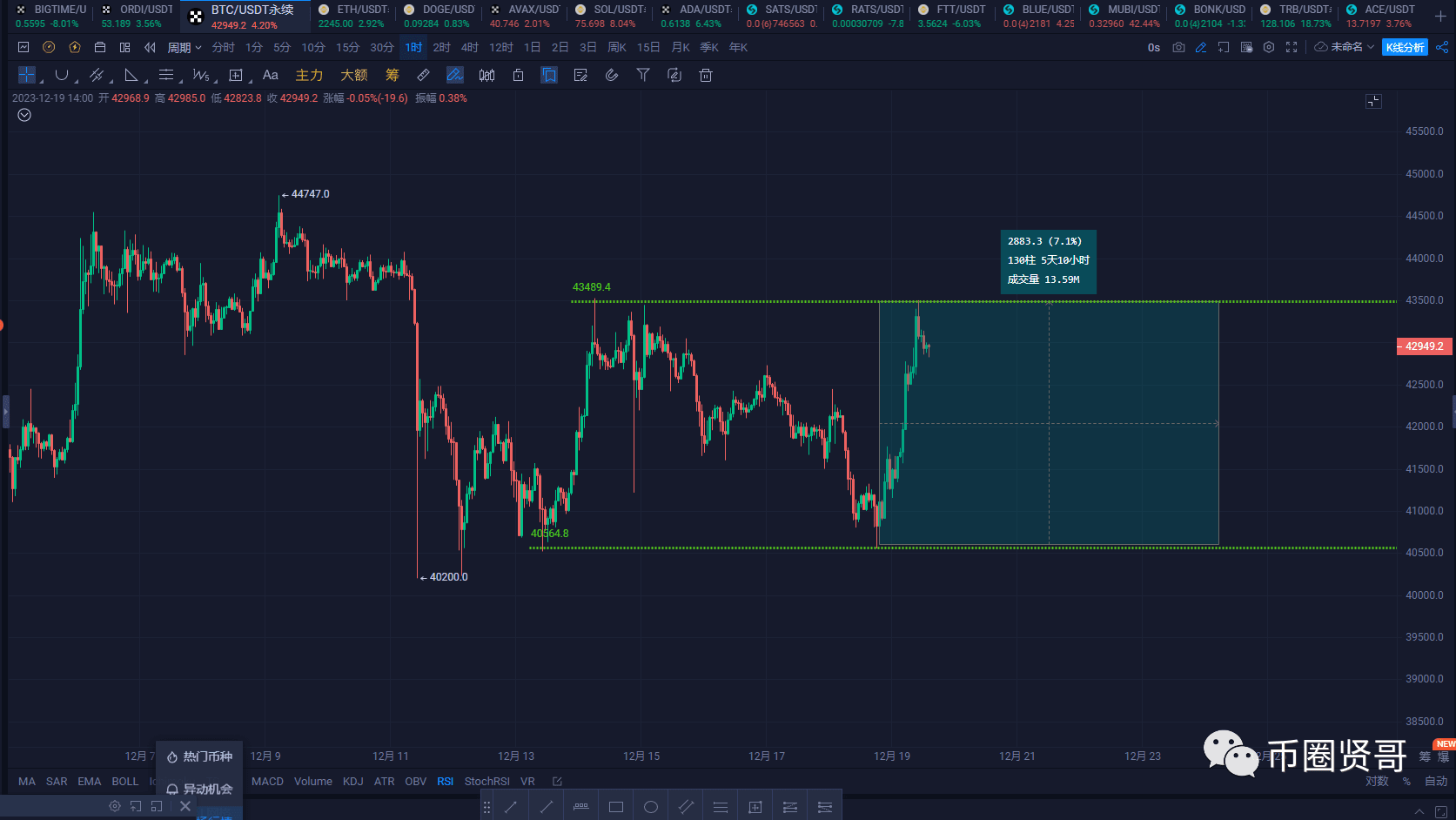 Il Bitcoin ha toccato il fondo e rimbalzato la scorsa notte, con un aumento di quasi il 7%; il prezzo è tornato vicino a 43000, il supporto a 40500 non è stato rotto, e ciò che pensavamo ieri, ossia che il prezzo potesse subire una correzione maggiore, non si è verificato.