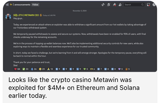 Il 3 novembre la piattaforma di casinò online MetaWin è stata vittima di un grave exploit che ha comportato perdite per circa 4 milioni di dollari. Secondo il CEO Skel, tale importo è stato reintegrato dopo l’attacco.