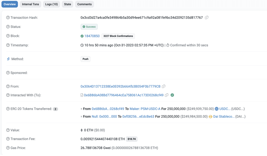 Riconoscendo l'urgenza della situazione, MakerDAO ha rapidamente trasferito 250 milioni di dollari da Coinbase Custody allo Stability Module (PSM) di DAI. Al momento, il conto Coinbase Custody di MakerDAO contiene solo 250 milioni di dollari.