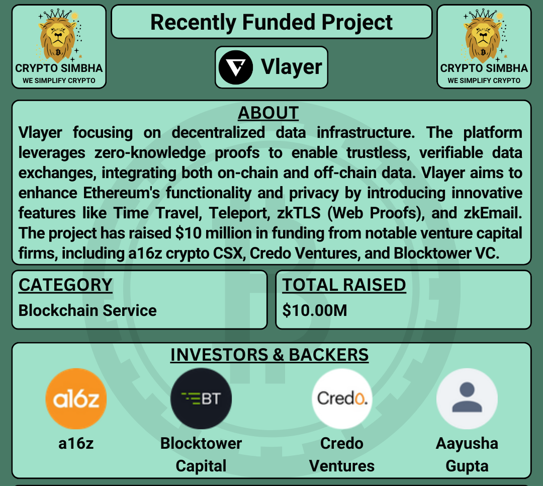 🔹Informazioni: Vlayer si concentra su un'infrastruttura dati decentralizzata. La piattaforma sfrutta le prove a conoscenza zero per abilitare scambi di dati verificabili e senza fiducia, integrando dati sia on-chain che off-chain. Vlayer mira a migliorare la funzionalità e la privacy di Ethereum introducendo caratteristiche innovative come Time Travel, Teleport, zkTLS (Web Proofs) e zkEmail. Il progetto ha raccolto 10 milioni di dollari in finanziamenti da importanti società di venture capital, tra cui a16z crypto CSX, Credo Ventures e Blocktower VC. Con sede a Varsavia, Polonia, Vlayer è impegnata a rivoluzionare l'interazione dei dati all'interno dei contratti smart, rendendola più sicura ed efficiente. 🚀🌐