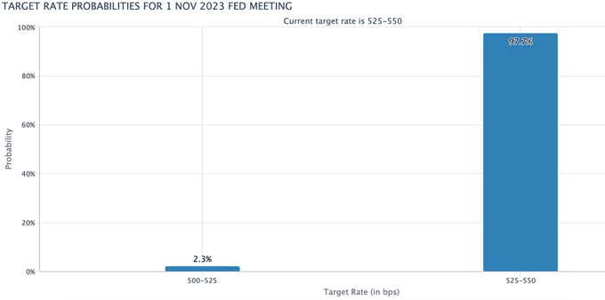 Questo scenario comporterebbe che la Federal Reserve sospenda temporaneamente l'aumento dei tassi e indichi con forza la possibilità di ulteriori aumenti dei tassi prima della fine dell'anno. Il presidente Jerome Powell sottolinea una forte ripresa della crescita nel Q3, minimizzando al contempo l'importanza di eventuali potenziali shock all'economia più ampia nel Q4.