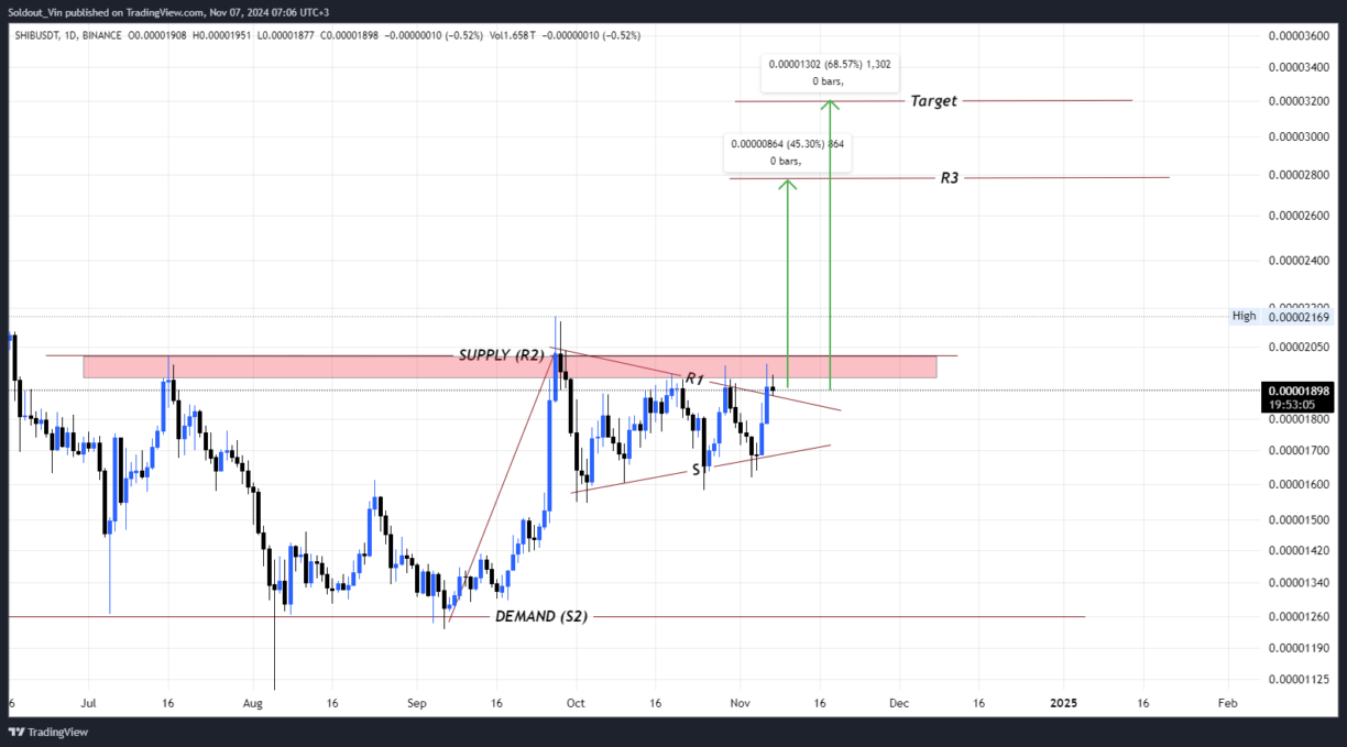 Se il prezzo supera la resistenza, salirebbe immediatamente del 45% a $0.000028 e del 68% a $0.000032 prima di muoversi più in alto a $0.000 081.