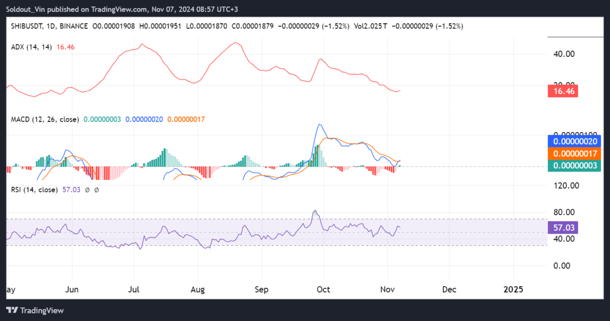 Un'analisi dell'Indice Direzionale Medio (ADX) nel grafico giornaliero mostra che è a 16.46 ma sta salendo, il che indica che la volatilità è bassa ma in aumento. Combinato con l'attuale azione di prezzo di SHIB, è un'indicazione rialzista che la pressione d'acquisto potrebbe tornare alla meme coin.