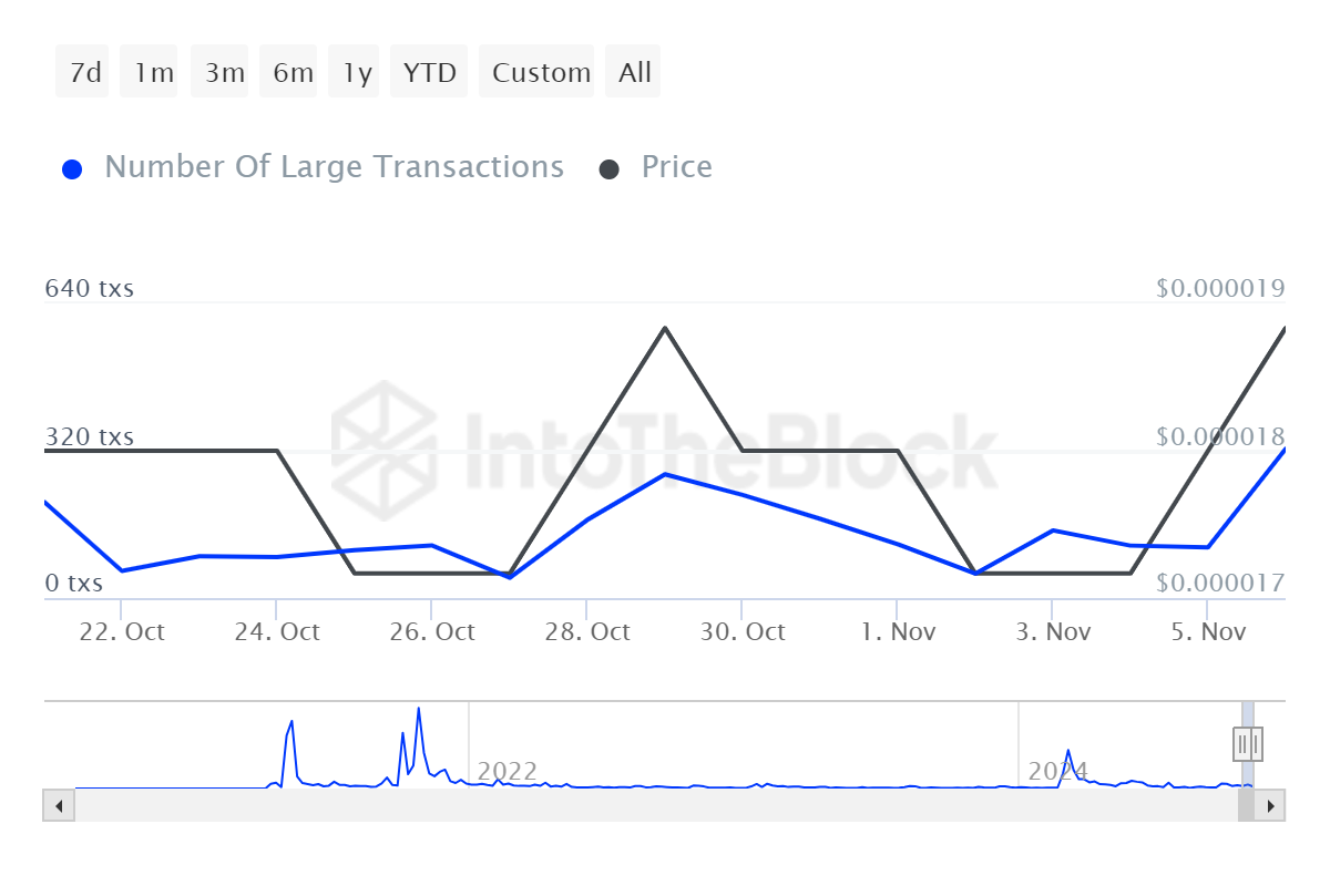 Questo è confermato da un picco nel conteggio delle transazioni dei grandi detentori, che è aumentato da 53 transazioni (txs) a 324 txs. Questo suggerisce che i grandi investitori sono fortemente interessati a SHIB perché si aspettano che il prezzo possa aumentare.