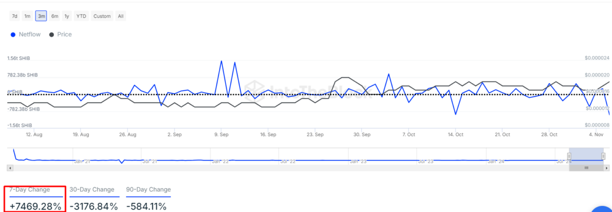 I balene SHIB sentono che qualcosa sta per accadere poiché hanno accumulato enormi quantità di token nell'ultima settimana. I dati di IntoTheBlock (ITB) mostrano che le balene hanno aumentato le loro partecipazioni in SHIB del 7.469% in soli 7 giorni. Anche se il NetFlow mensile è ancora in calo del 3.000% rispetto al mese scorso, l'aumento nella settimana suggerisce che la tendenza sta cambiando.