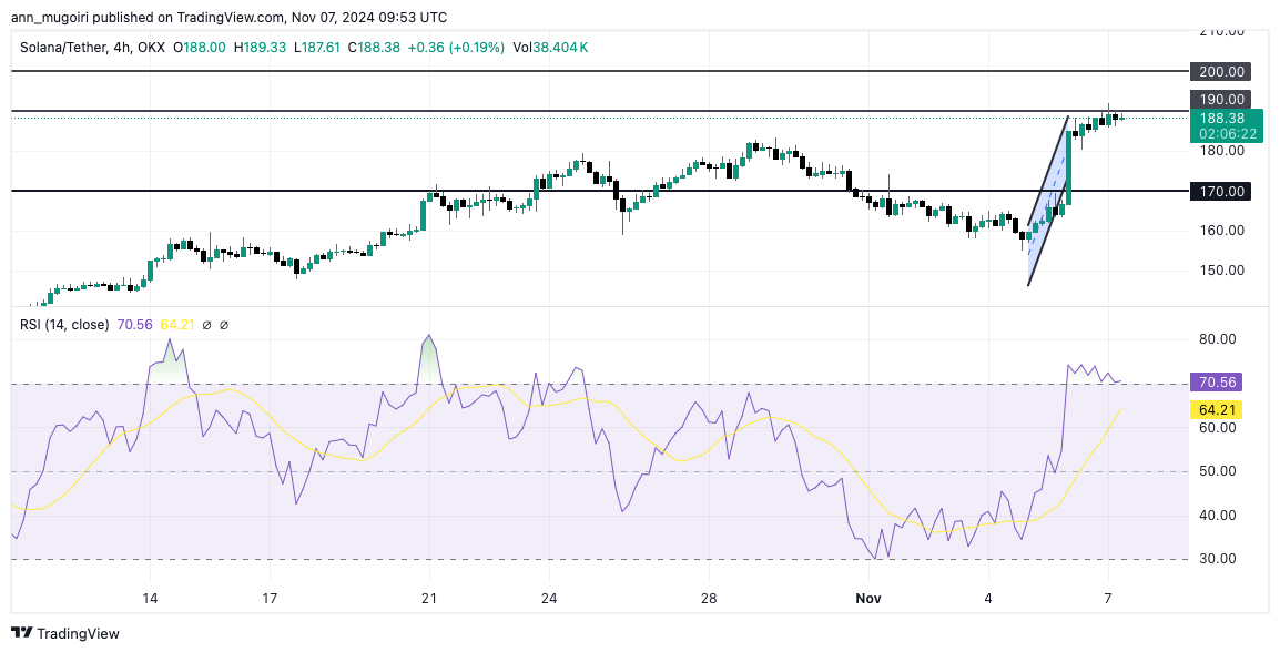 La criptovaluta di layer one ha mostrato una performance robusta, l'ultimo prezzo di SOL è di $189, con un aumento del 4% nelle ultime 24 ore. Questo movimento di prezzo riflette un intervallo giornaliero da un minimo di $183 a un massimo di $191, indicando un notevole aumento dell'interesse degli investitori. Negli ultimi mesi, il prezzo di SOL ha registrato un aumento del 31% dopo il rally del mercato a seguito delle elezioni statunitensi.
