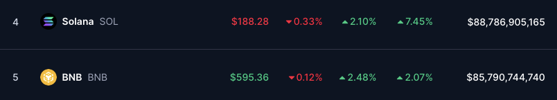 Il prezzo di Solana ha raggiunto una pietra miliare notevole, superando Binance Coin per assicurarsi la posizione di quarta criptovaluta più grande per capitalizzazione di mercato, attualmente valutata a $89,14 miliardi. Al momento della scrittura, il prezzo di BNB si aggirava attorno ai $595, mantenendo una capitalizzazione di mercato di $85,87 miliardi.