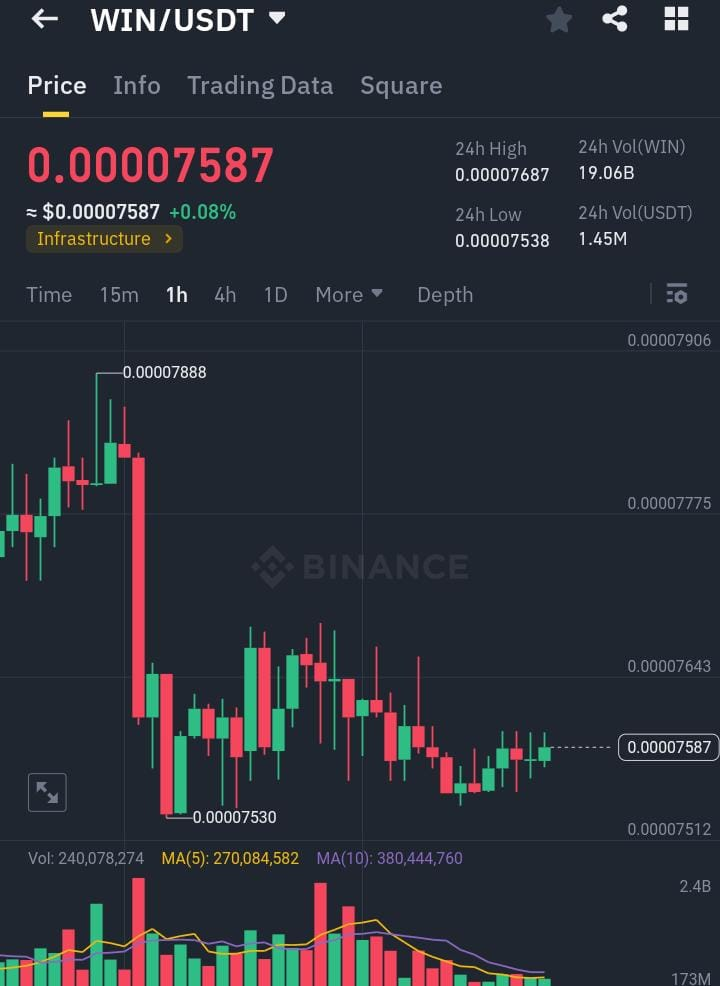 WIN/USDT a un prezzo attuale di $0.00007587 (+0.08%), analisi da considerare:💥🚀