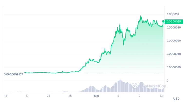 Al momento, PEPE è valutato a $0.000008933 nel mercato. Nonostante i molti zeri in questa cifra, il prezzo della moneta è incredibilmente aumentato di oltre il 15000%. A causa di questa crescita, alcuni investitori stanno speculando sulla possibilità che la moneta raggiunga $1 in futuro.