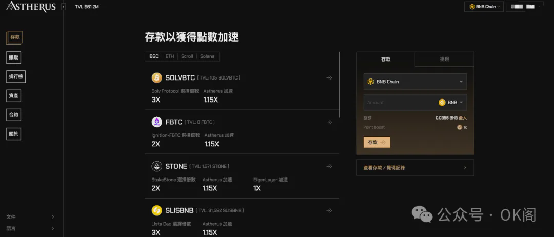 AstherusEarn è un pool di rendimento progettato attivamente; gli utenti devono solo mettere in staking asset mainstream nel pool per ottenere reddito.