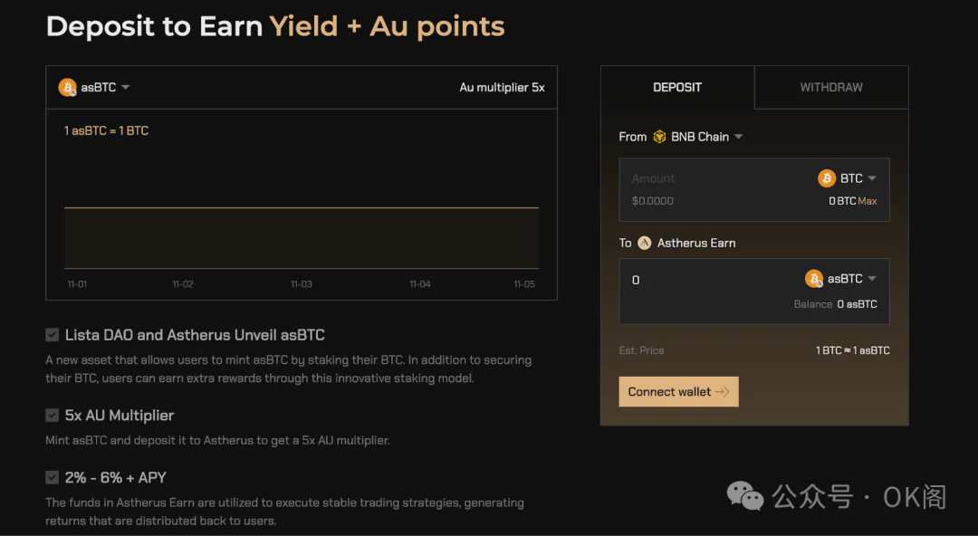 Sulla base di ciò, quando gli utenti effettuano staking dei loro asset in AstherusEarn, generano ulteriori APR del 2-6%, che si riflettono nel valore netto degli asTokens. Inoltre, gli utenti possono ricevere incentivi in AU punti. Pertanto, gli asTokens sembrano più un asset intenzionale, consentendo agli utenti di coniare asTokens con un clic e realizzare direttamente i rendimenti attesi.