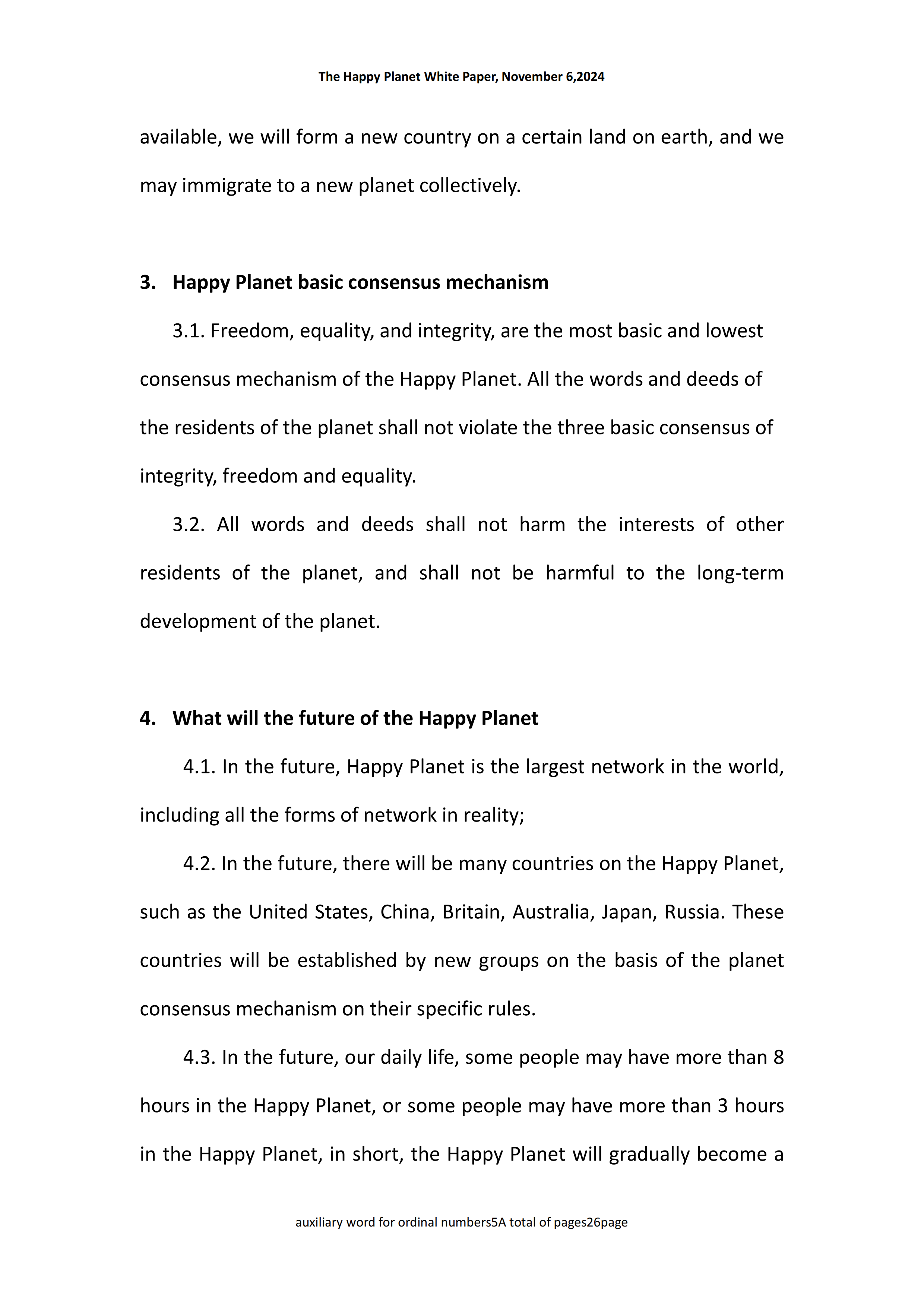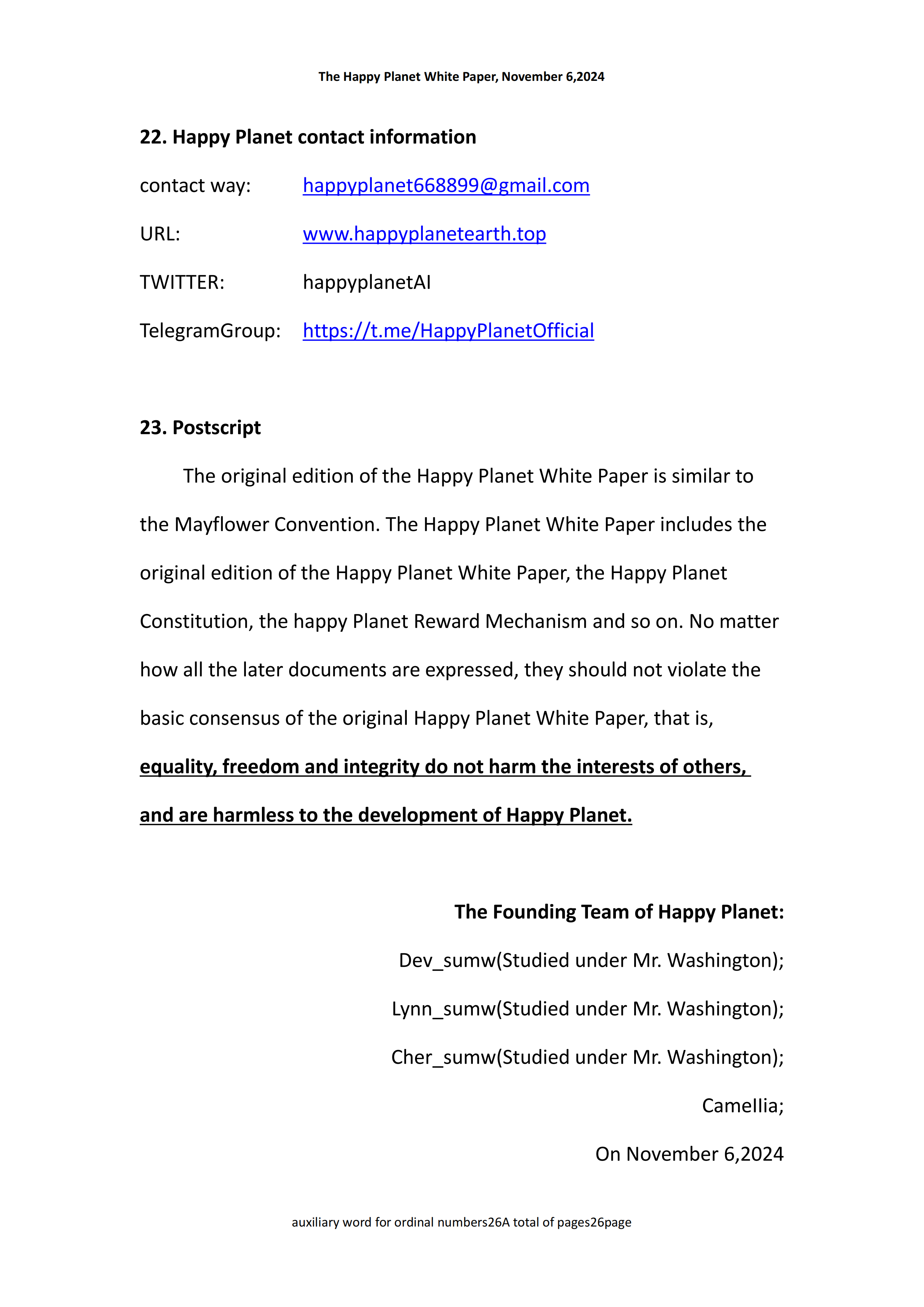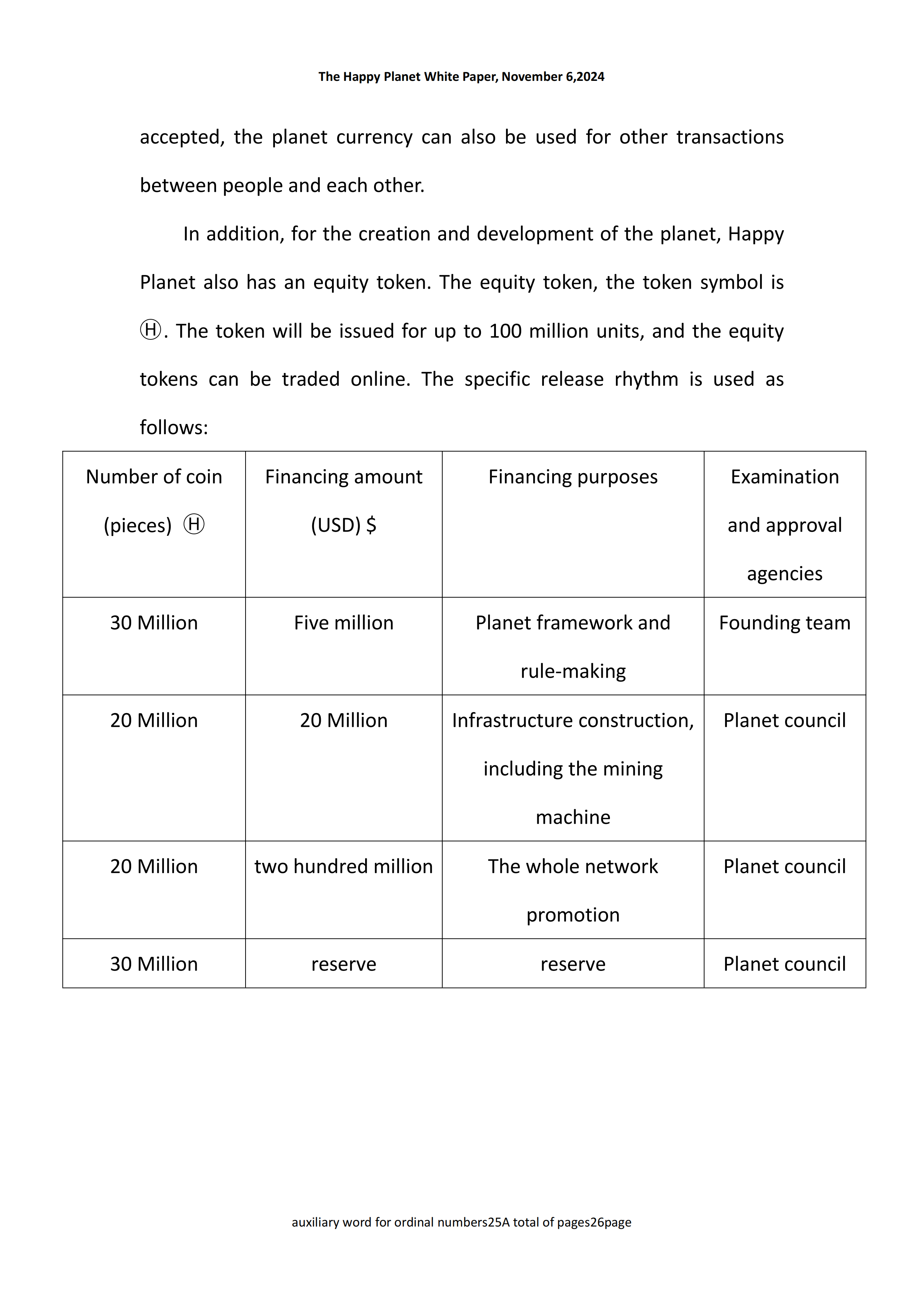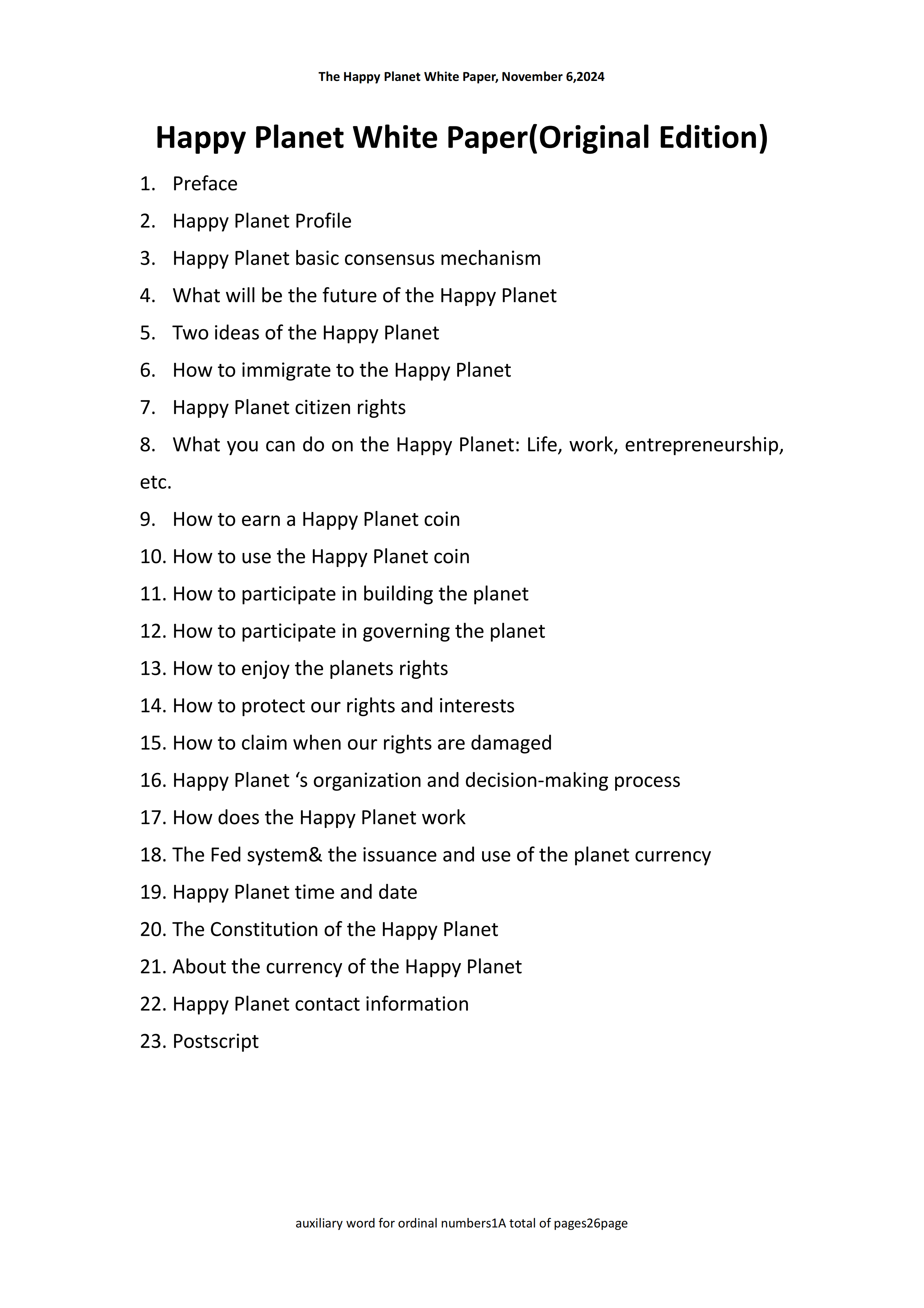 Happy Planet è una comunità metaverso creata sulla base di blockchain, WEB3 e tecnologia AI. Puntiamo a creare un mondo più democratico, libero, aperto, vibrante e prospero degli Stati Uniti. Il White Paper di Happy Planet è una panoramica di base dell'intero pianeta.