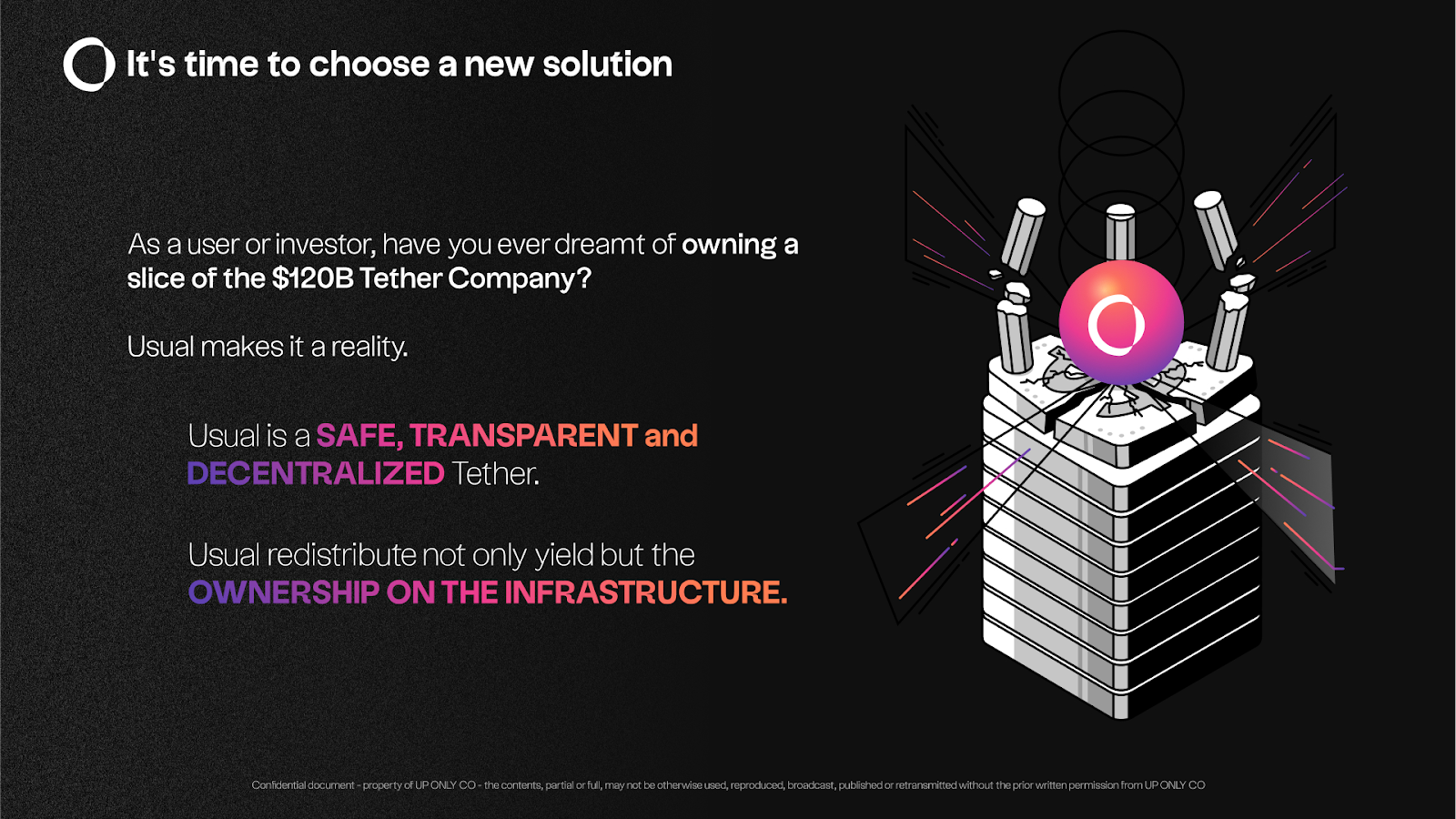 Al centro della filosofia di USUAL c'è la ridistribuzione del potere e della proprietà. La piattaforma dà potere ai provider TVL e alle terze parti, rispecchiando uno scenario in cui i provider TVL di Tether possederebbero collettivamente l'azienda e i relativi flussi di entrate.