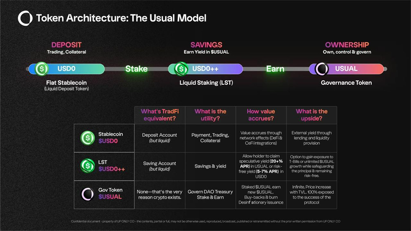 • $USUAL premia la crescita di USD0, la sua adozione e il suo utilizzo all'interno dell'ecosistema. $USUAL agisce come proprietà sui ricavi del protocollo, un token di governance supportato da flussi di cassa reali.