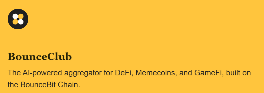 BounceBit sta anche creando un ecosistema divertente e interattivo con BounceClub. Si tratta di un aggregatore basato sull'intelligenza artificiale per DeFi, Memecoin e GameFi, basato sulla BounceBit Chain. Per coloro che desiderano espandere il proprio portafoglio di criptovalute ed esplorare diversi casi d'uso per $BB, BounceClub offre numerose opportunità.