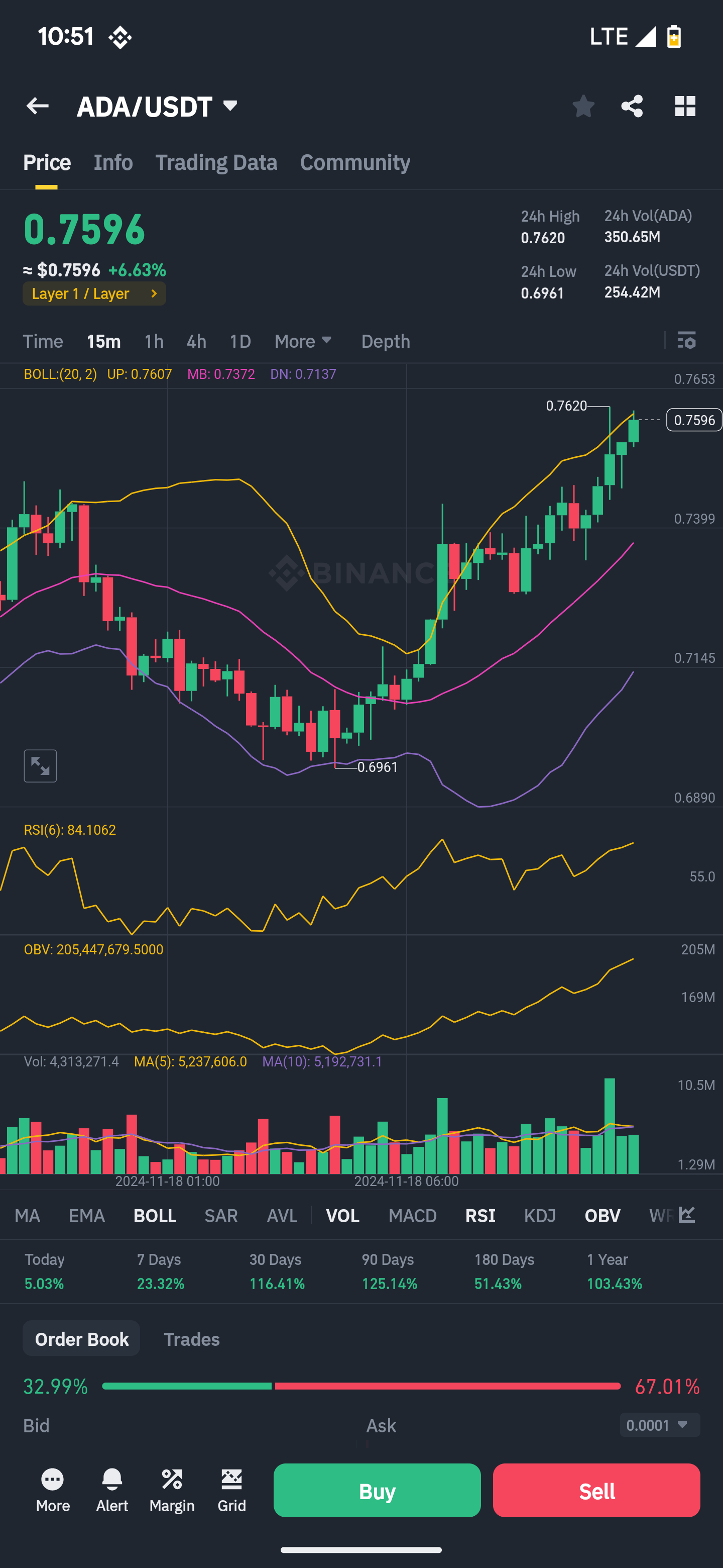 1. Andamento dei prezzi: $ADA/USDT è in un forte trend rialzista, con il prezzo che ha superato significativi livelli di resistenza, supportato da elevati volumi di trading.
