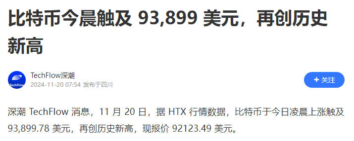 Il 19 Bitcoin ha toccato un nuovo massimo storico, toccando il massimo di 93.844 dollari, in rialzo di oltre il 3% in 24 ore.