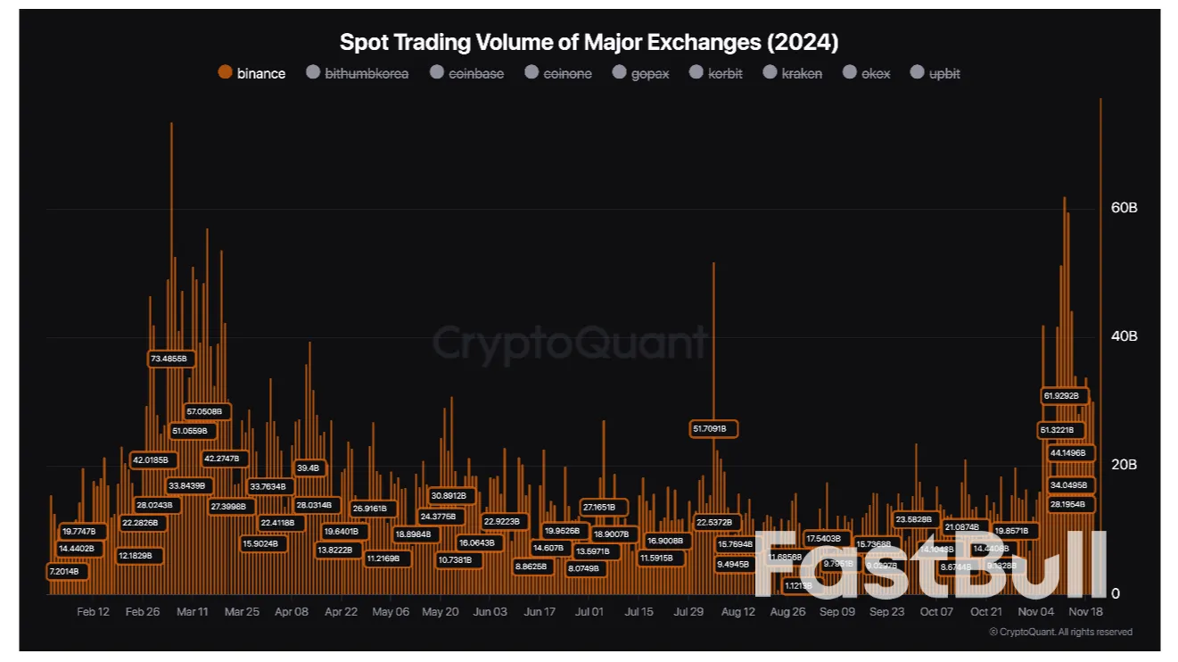 "Il recente aumento del volume degli scambi spot (60 miliardi) su Binance si è verificato il 12 novembre, in coincidenza con l'avvicinamento della capitalizzazione di mercato delle criptovalute al suo precedente massimo.