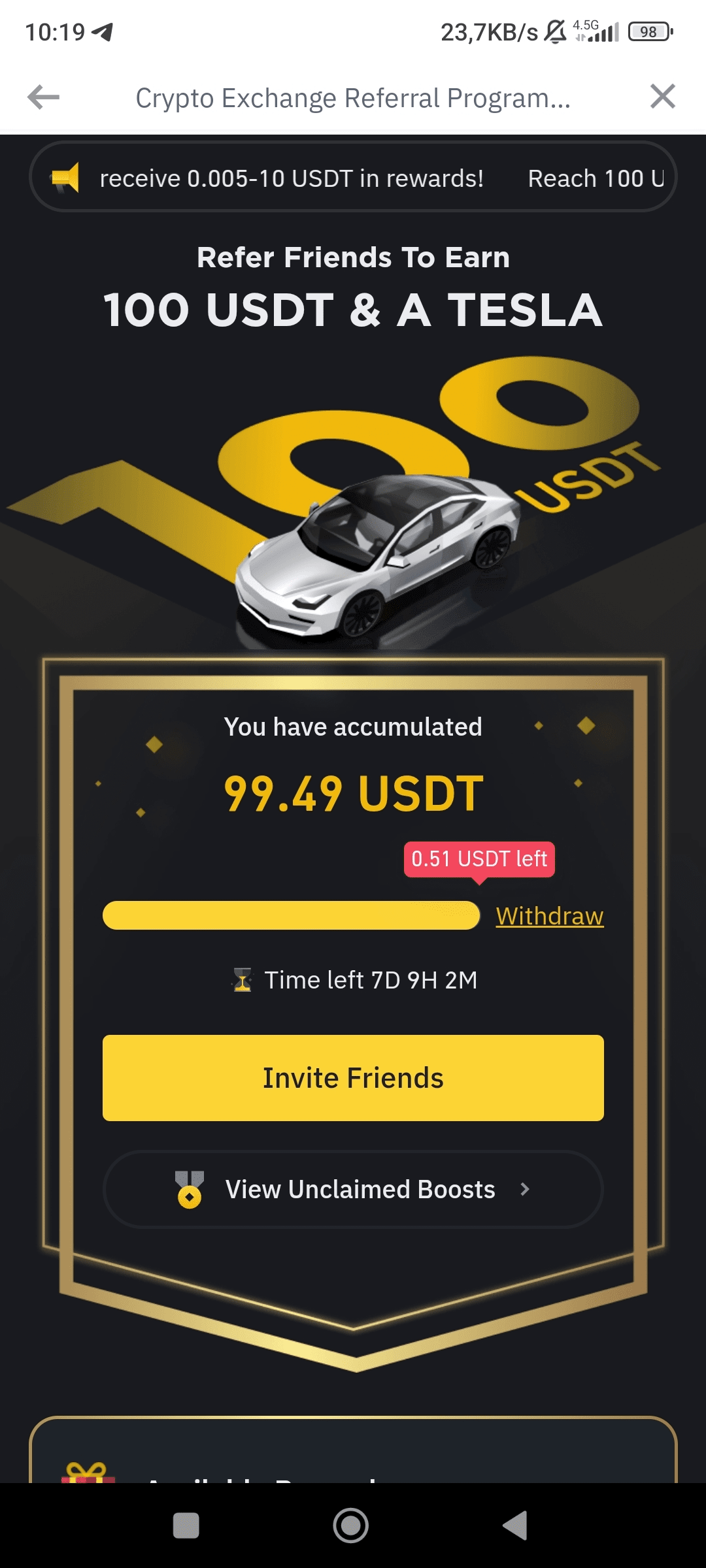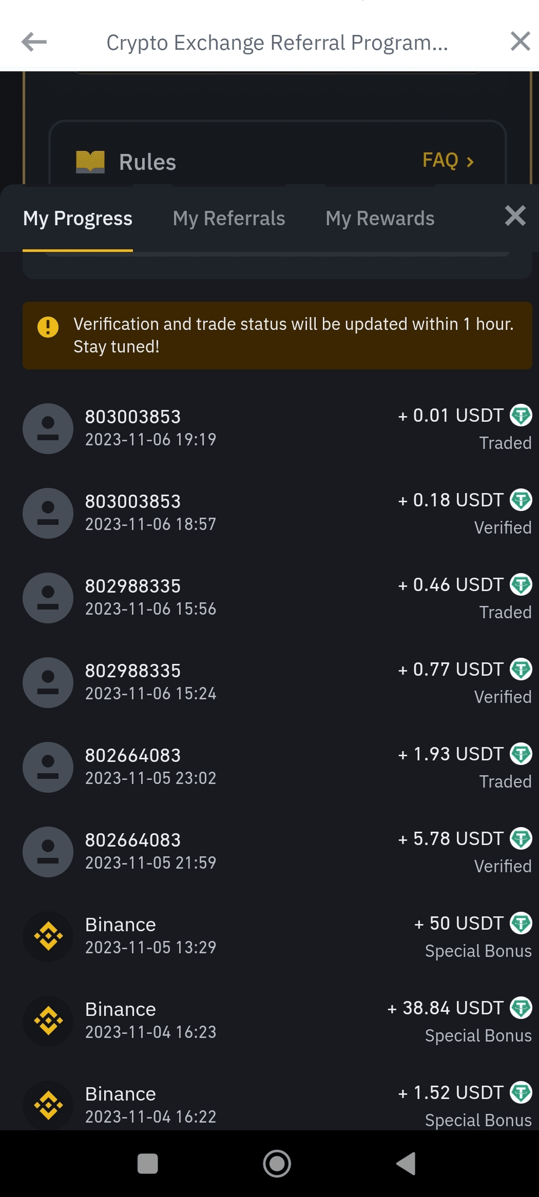 Ho aderito al programma Binance Lite Referral e ho ricevuto 3 referral con successo; tutti i miei referral hanno depositato denaro e fatto trading. Ma le ricompense sono sempre più basse. Mi servono solo 0,5 USD per il premio, ma Binance mi ha dato solo 0,19 USD come premio per l'ultimo referral (verificato e negoziato).