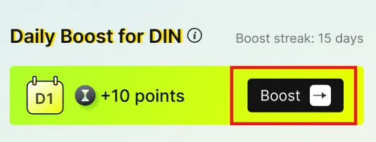 Aumenta DIN cliccando sul pulsante “Aumenta” una volta ogni 24 ore. Ad esempio, se aumenti alle 22:00 del 13 gennaio, il tuo prossimo aumento può essere fatto tra le 22:00 del 14 gennaio e le 22:00 del 15 gennaio per mantenere la tua serie. (Per completare il Daily on-chain Boost, assicurati di avere BNB per le spese di gas.)