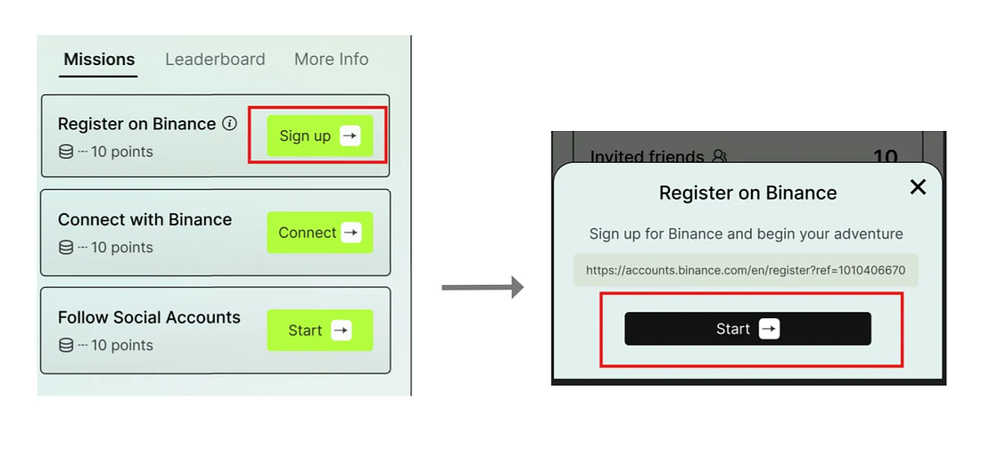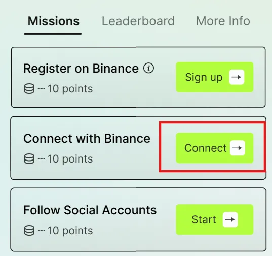 Collega il tuo wallet Binance Web3 per partecipare alle missioni e guadagnare 10 punti. (Assicurati di essere connesso al Wallet MPC di Binance, poiché solo gli utenti che partecipano con il Wallet MPC sono idonei ai premi.)