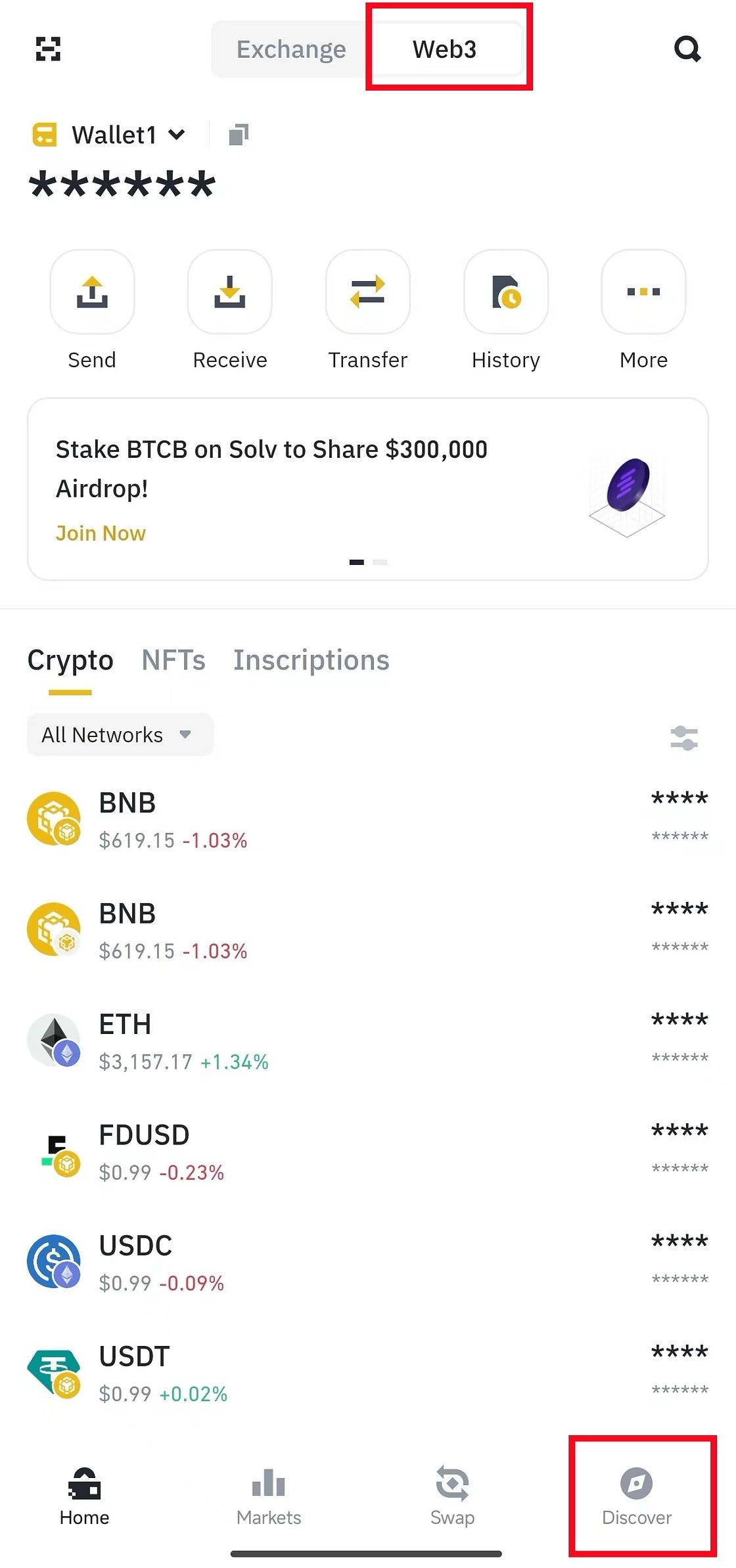 1. Apri l'App di Binance, seleziona Web3, clicca su Scopri e inserisci l'URL della campagna