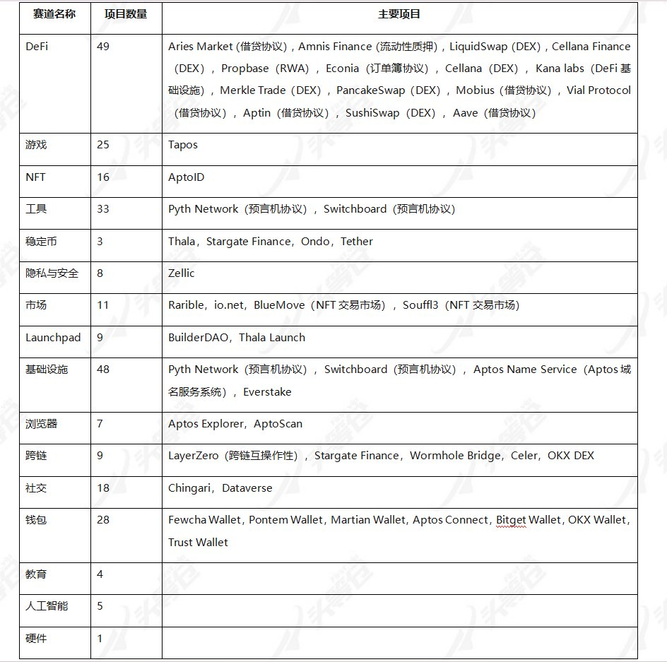 Essendo un progetto Layer 1, con il supporto di eccellenti prestazioni di rete, Aptos ha sia ampiezza che profondità nel layout dell'ecosistema. La sua ampiezza si riflette nel ricco layout dei tracciati. All'11 novembre 2024, l'ecosistema di Aptos comprende fondamentalmente 16 tracciati tradizionali attuali e il numero di progetti ecologici ha raggiunto 192, inclusi 49 progetti DeFi e 48 progetti, 28 progetti di portafoglio, 25 progetti di giochi, 18 progetti sociali e 16 progetti NFT Ci sono molti progetti stellari a cui il mercato presta attenzione. A giudicare dal numero attuale di progetti di tracciato di Aptos, l'attuale sviluppo dell'ecosistema di Aptos è ancora nel medio termine, concentrandosi su infrastrutture funzionali e infrastrutture di liquidità in futuro, quando la base ecologica della catena pubblica sarà completa e ricca Emergeranno più progetti e casi d’uso e l’ecosistema nel suo insieme avrà un maggiore potenziale di sviluppo.