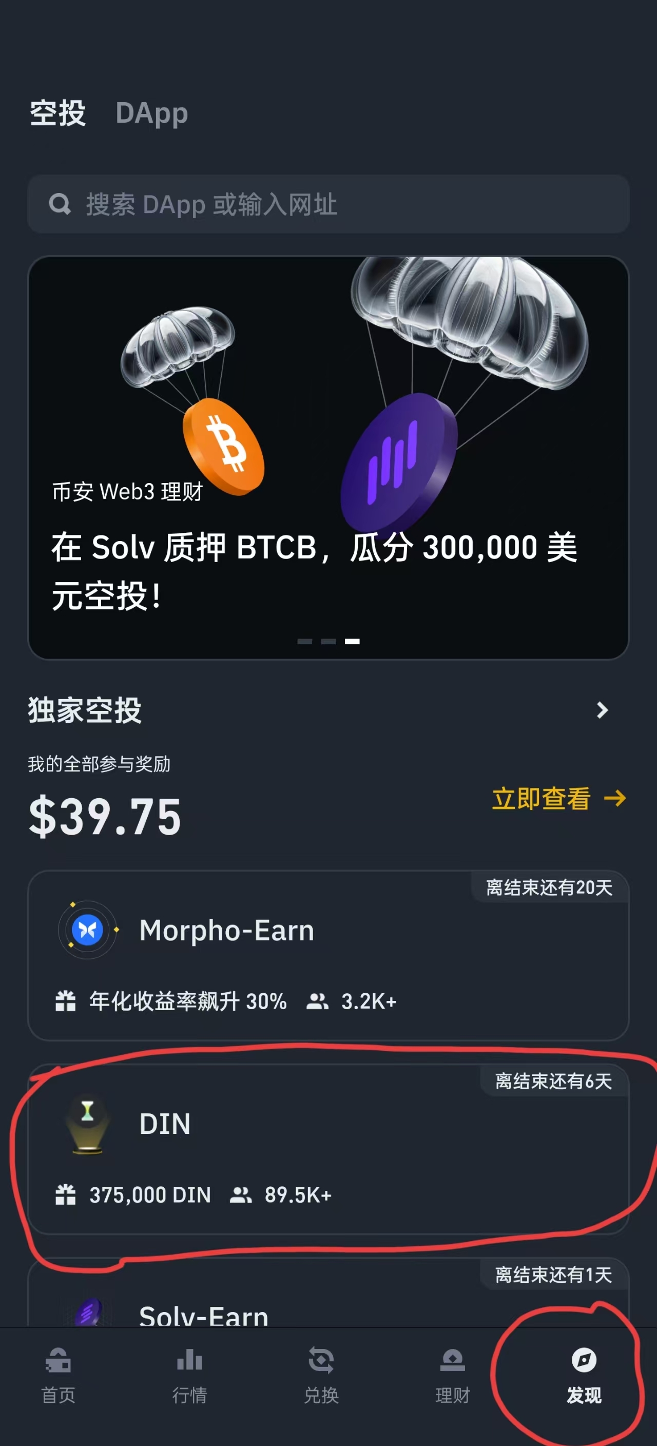 1. Apri l'app Binance, seleziona Web3, fai clic su Scopri, scegli DIN