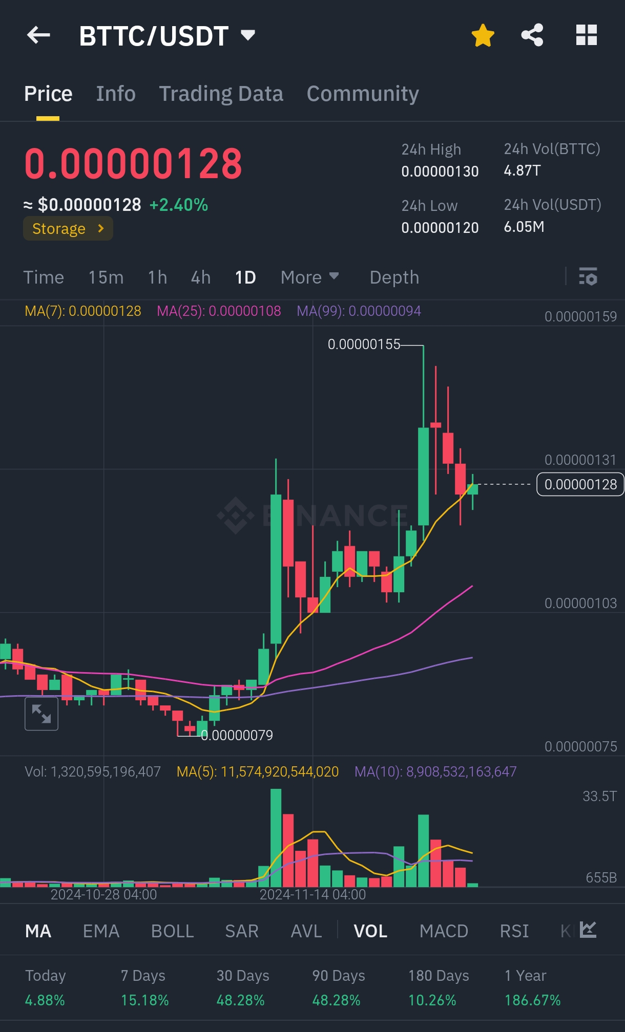 Nel dinamico mondo delle criptovalute, BitTorrent Chain (BTTC) è emersa come un concorrente degno di nota per gli investitori in cerca di ritorni sostanziali. A partire dal 27 novembre 2024, BTTC è scambiato a circa $0.00000128. Questo prezzo relativamente basso, insieme al suo modesto volume di scambi nelle ultime 24 ore, presenta un'unica opportunità #opportunity per guadagni significativi.