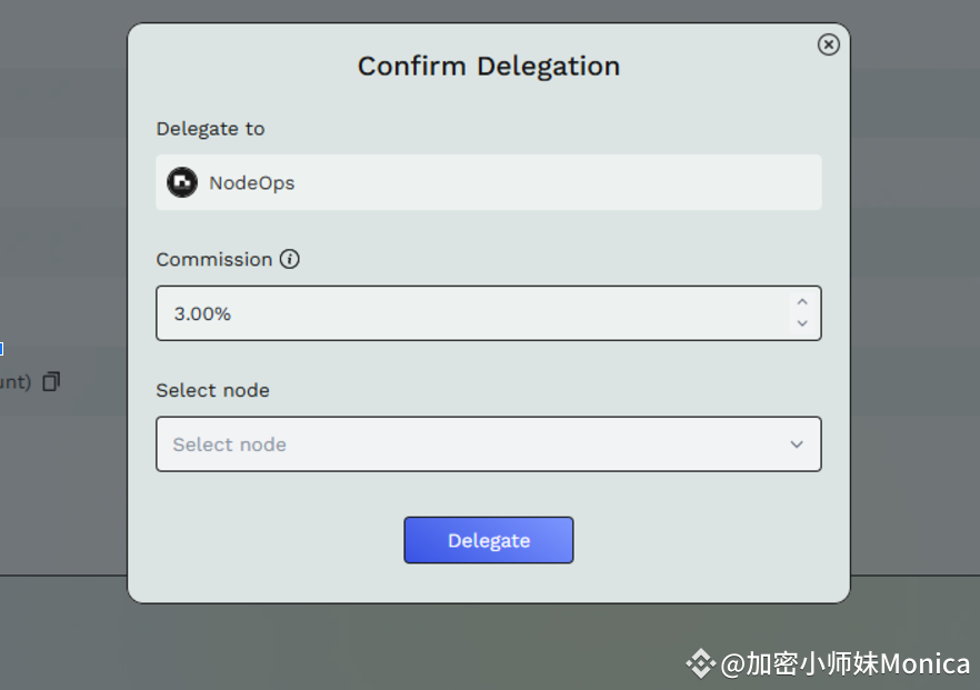 2. Inserisci il tasso di commissione e seleziona il nodo. Il tasso di commissione predefinito è impostato da DIN in base alle condizioni di mercato, ma può essere regolato se necessario. Dopo aver selezionato il nodo, conferma la delega, il tuo nodo sarà delegato all'operatore selezionato.