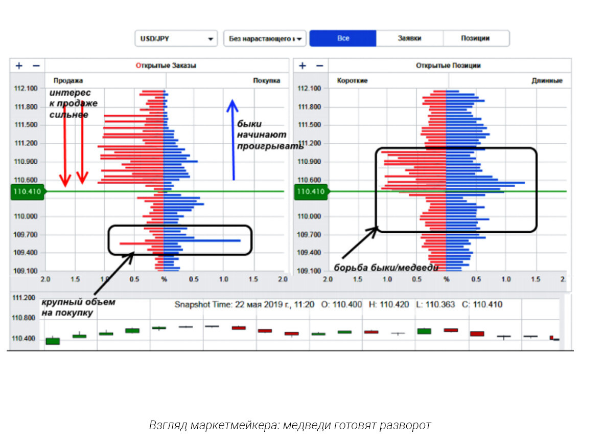 Il market maker, a sua volta, analizza il mercato "verticalmente": presta attenzione non solo al prezzo, ma anche ai volumi, alla direzione, al tipo di ordini, nonché a parametri come StopLoss e TakeProfit. Per lui è importante la dinamica dei volumi a specifici livelli di prezzo; vede tutti gli ordini di mercato e in sospeso (open interest) e tiene conto di come e quando chiudere le posizioni. Queste informazioni gli permettono di valutare con maggiore accuratezza lo stato attuale del mercato e la sua possibile direzione. Inoltre, MM può fornire alcune informazioni ai clienti VIP in base all'entità del loro capitale.