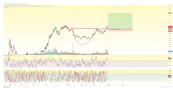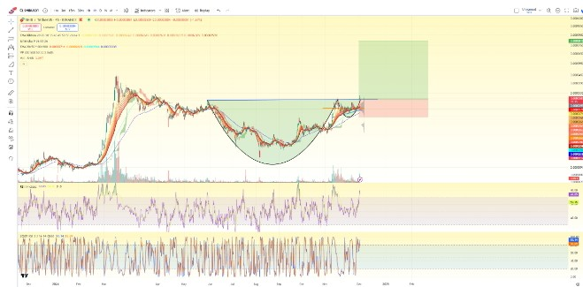 Il grafico mostra il potenziale di SHIB per una significativa rottura, con un modello di fondo arrotondato che segnala un forte setup rialzista 🎯. L'Indice di Forza Relativa (RSI) è elevato a 74, riflettendo un forte slancio rialzista ⚡, mentre il RSI Stocastico suggerisce anche condizioni di ipercomprato. Una rottura decisiva sopra i livelli di resistenza chiave potrebbe spingere SHIB verso la sua prossima zona obiettivo 🎯🔥. Le dinamiche di volume suggeriscono un crescente interesse e entusiasmo 📊, ma i trader dovrebbero esercitare cautela poiché i ritracciamenti sono comuni dopo forti rally 🔄. SHIB è pronta a fare progressi, ma è necessaria vigilanza per affrontare i potenziali ostacoli futuri 🐾💥.