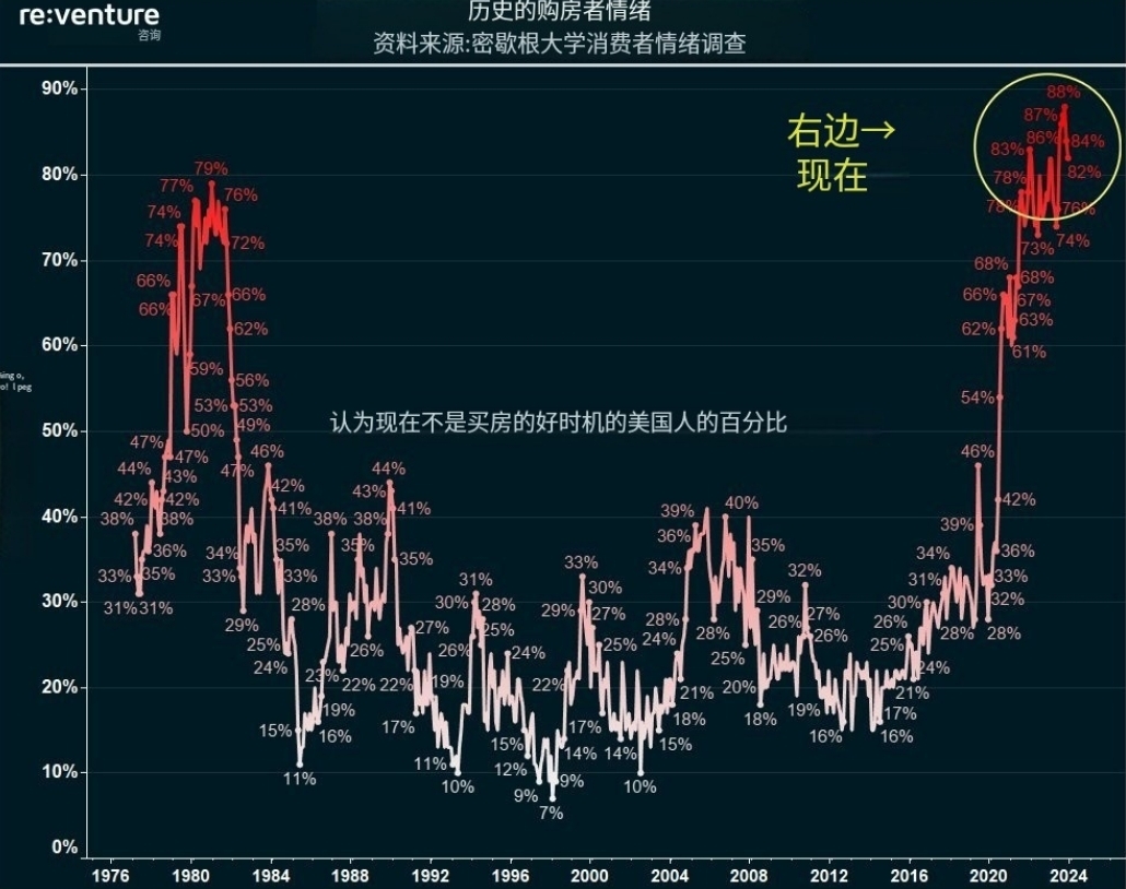 7. Oltre l'80% degli americani ritiene che ora non sia un buon momento per comprare una casa, questa percentuale è triplicata negli ultimi quattro anni, mentre i tassi ipotecari sono saliti vicino al 7%, i prezzi delle case sono ai massimi storici (Fig. 2)