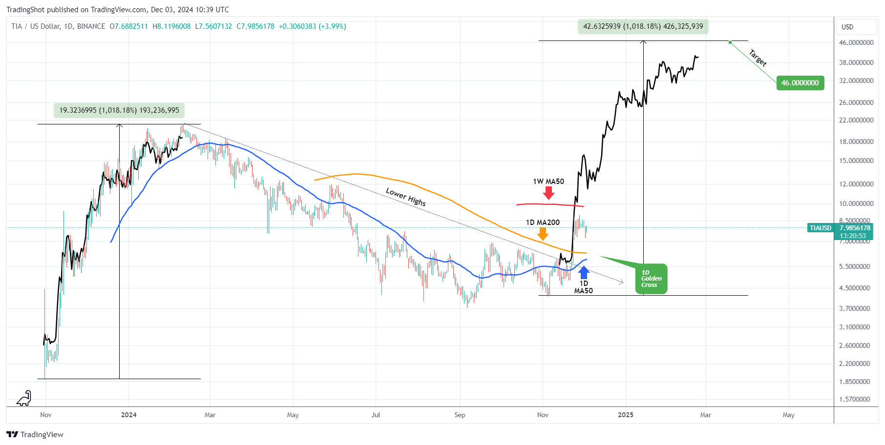 Celestia (TIAUSD) è in vista del suo primo Golden Cross 1D della storia, che avrebbe dovuto essere completato entro lunedì prossimo al più tardi. Dopo aver superato la linea di tendenza Lower Highs che ha dominato la maggior parte del 2024, l'unico ostacolo tecnico ora è la MA50 1W (linea di tendenza rossa).