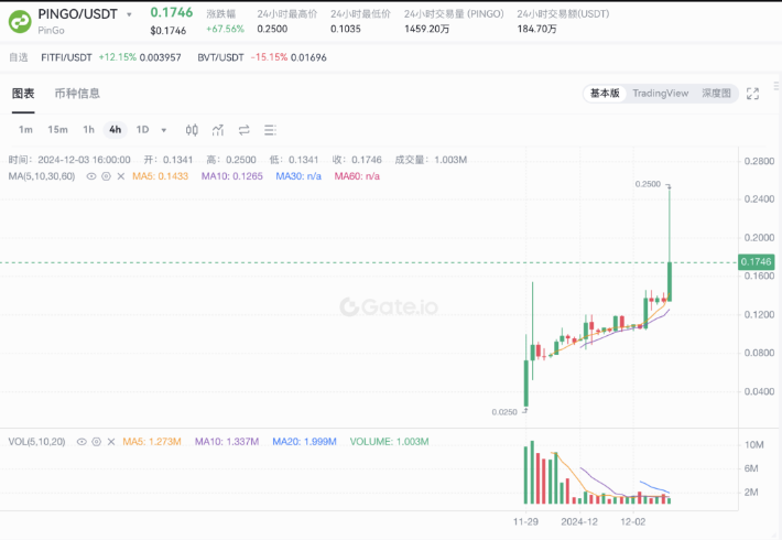 Venerdì scorso, il token economico PinGo dell'infrastruttura AI ecologica TON PINGO è stato quotato sullo scambio Gate.io Dopo l'inizio delle negoziazioni, il token PINGO ha seguito una tendenza fluttuante al rialzo dopo un leggero aggiustamento, rompendo il picco di un gran numero di token in circolazione. lanciato online. Tendenza "abituale". Ad un prezzo massimo di circa 0,25 dollari, il FDV di PinGo ammonta a circa 250 milioni di dollari.