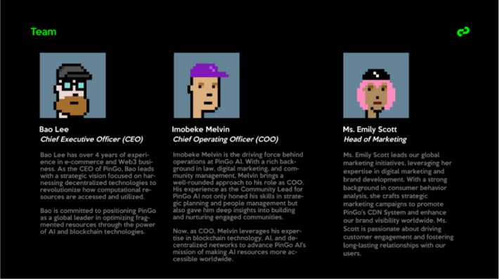 A giudicare dalla documentazione ufficiale di PinGo, il team principale di PinGo ha una vasta esperienza nella community e nel marketing. L’incomprensione della maggior parte delle persone sui progetti di intelligenza artificiale è che il team principale debba avere ricche capacità tecniche, ma in realtà la tecnologia di intelligenza artificiale di base è completata da pochi geni di grande talento. A livello applicativo, il metodo operativo dei prodotti di intelligenza artificiale deve essere sufficiente capacità di far conoscere ed utilizzare il prodotto a più persone. L’attuale configurazione del team di PinGo dimostra perfettamente le sue capacità operative.