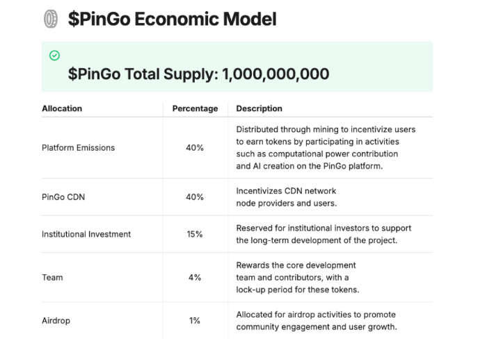 PinGo è un progetto AI+DePIN ecologico di Ton che mira a utilizzare in modo efficace la potenza di calcolo sparsa e inattiva e fornire una base di risorse informatiche per lo sviluppo di modelli di intelligenza artificiale attraverso DePIN e soluzioni cloud decentralizzate. Il concetto copre gli attuali popolari AI, DePIN, TON, ecc., partendo dall'ecosistema Telegram e accumulando prima utenti seed, costruendo gradualmente la rete CDN pianificata, realizzando una rete decentralizzata di risorse di archiviazione e calcolo e potenziando la formazione e lo sviluppo dell'IA. (Per un'interpretazione dettagliata di PinGo, fare riferimento a (Interpretazione approfondita di PinGo: entrare nel mercato dell'intelligenza artificiale da Telegram, un grande sogno di una rete informatica decentralizzata))