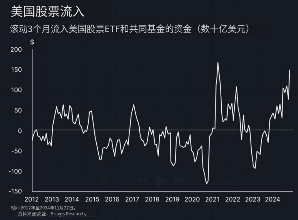 2. Recentemente, il flusso di fondi negli ETF del mercato azionario statunitense ha raggiunto i 150 miliardi di dollari, mentre l'indice #标普500 è aumentato del 26% quest'anno, il che indica che il mercato azionario americano è diventato sopravvalutato.