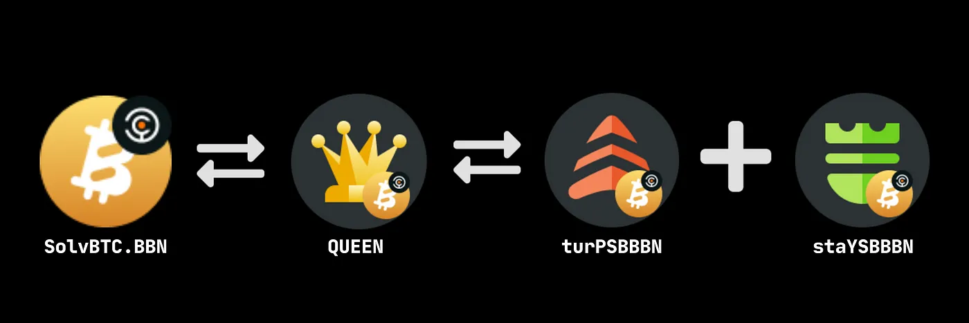 SolvBTC.BBN può essere scambiato 1:1 con sbbbnQUEEN, e come fondo madre sbbbnQUEEN, ogni sbbbnQUEEN può essere ulteriormente suddiviso in fondi figli 0.9 staYSBBBN + 0.1 turPSBBBN.