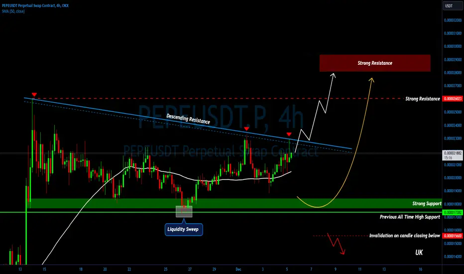 Forte zona di supporto: una zona d'acquisto significativa si trova tra 0,00001850$ e 0,00001730$, anch'essa in linea con il precedente massimo storico. Questa zona può fungere da rete di sicurezza per gli acquirenti se il prezzo scende nuovamente.