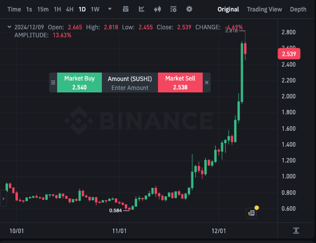 A partire da dicembre 2024, SUSHI è scambiato a $2.54, con una capitalizzazione di mercato di circa $476 milioni, classificandosi 166° per capitalizzazione. Il token ha mostrato un'impressionante ripresa dal suo minimo annuale di $0.45, segnando un aumento del 444.29% da quel punto. Il suo volume di scambi nelle ultime 24 ore ha superato i $803 milioni, indicando una forte attività di mercato.