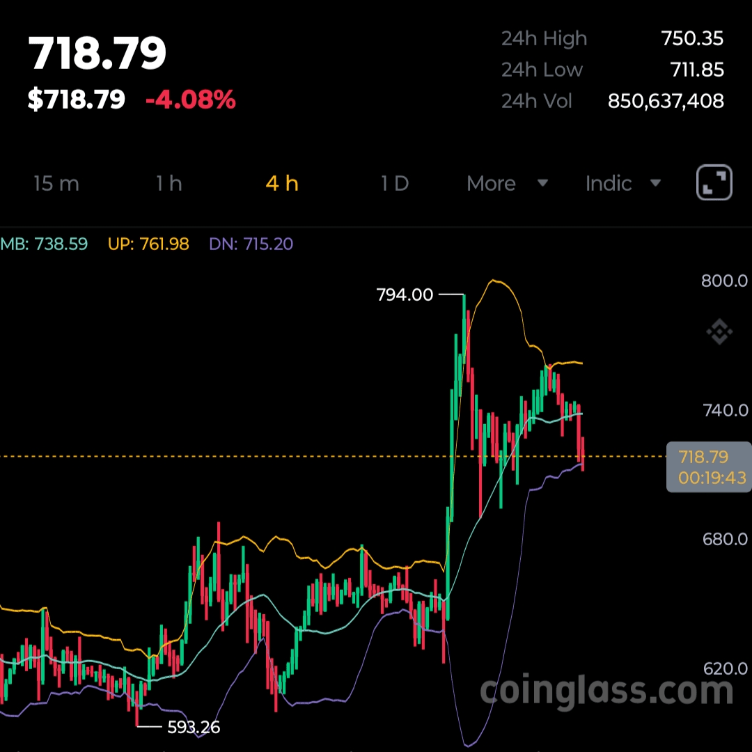 Supporto: $715 (linea Bollinger inferiore), con supporto psicologico nelle vicinanze a $711 (visibile sulla mappa delle transazioni).
