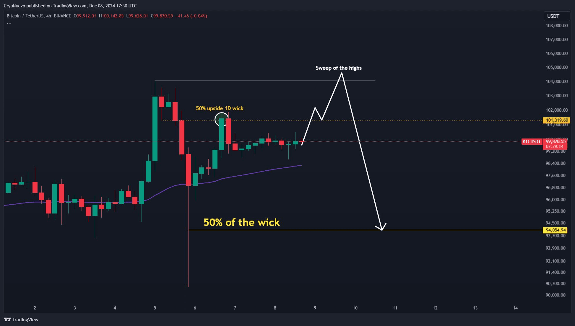 Fai attenzione. Bitcoin potrebbe riempire metà della gigantesca candela giornaliera a $92.000 stampata durante una cascata di liquidazione il 5 dicembre.